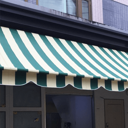 一体型は、テントシート生地続きに端をフリルに仕上げる方法です。軒先テントなどに設置する場合には一体型をご利用ください。