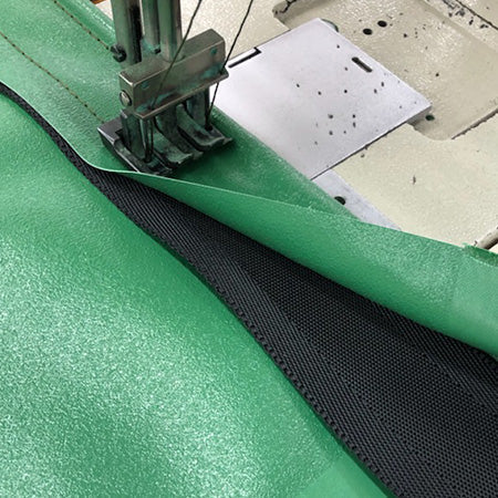 シートベルト補強加工は、自動車用のシートベルトを生地のふちに挟みこみ強度を上げるための加工です。引っ張りに強くなるため、雨よけ・日よけテントなど生地をピンと張って設置するような場合におすすめの加工です。
