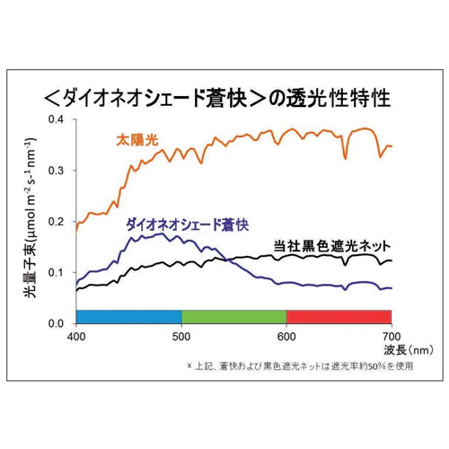 夏季のホウレン草栽培に最適なダイオネオシェード蒼快。赤色光をカットし、青色光を多く透過させ、ホウレン草栽培に最適な光環境を保ちます。紫外線耐候剤入りなので、長期の仕様が可能です。軽量なカラミ織組織で、外部フィルムにべたつく心配がありません。