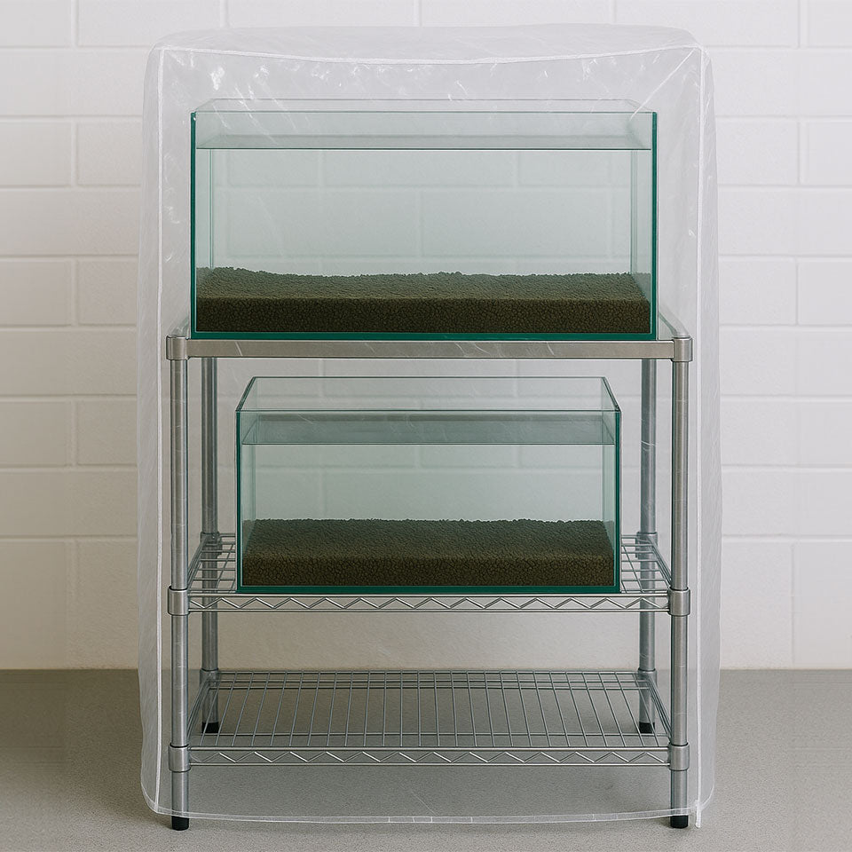 ペットショップやアクアリウムで使用される大切な水槽や生体を、風・ほこり・害虫・水はねから守り、清潔で安定した飼育環境を整えるオーダーメイドビニールカバーです。ラックのサイズや段数、配置に合わせて製作できるため、市販の既製品では合わない水槽ラックや独自の設置環境にもぴったりフィットし、効率的な管理をサポートします。