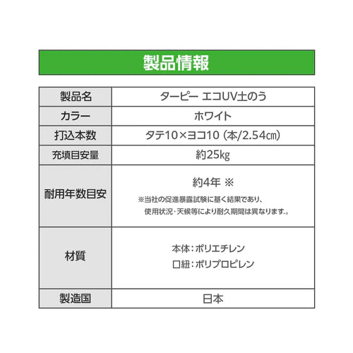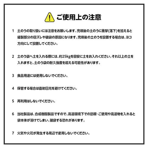 - 土のう袋へ土を入れる際には、約25kgを目安に土をお入れください。それ以上の土を入れますと、土のう袋の耐久強度を超える可能性があります。