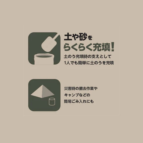 土のう充填作業専用補助具です。持ち運びに便利な超軽量型。保管時は丸めてコンパクトに収納できます。おひとりでの充填作業時に土のうの支えとなってくれるアイテムです。