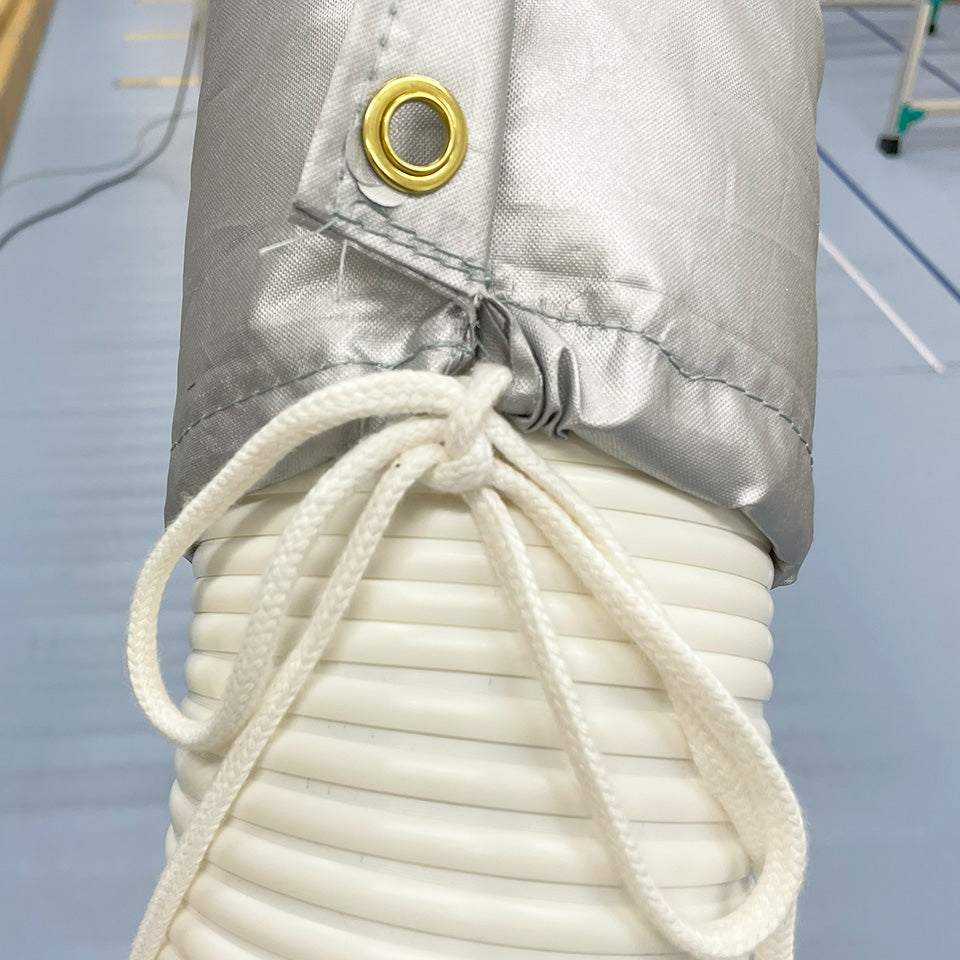 スポットクーラーとの接続は送風ダクトにかぶせてロープを絞るだけ。一般的なφ125口径のスポットクーラーに対応しています。(φ140未満に対応)