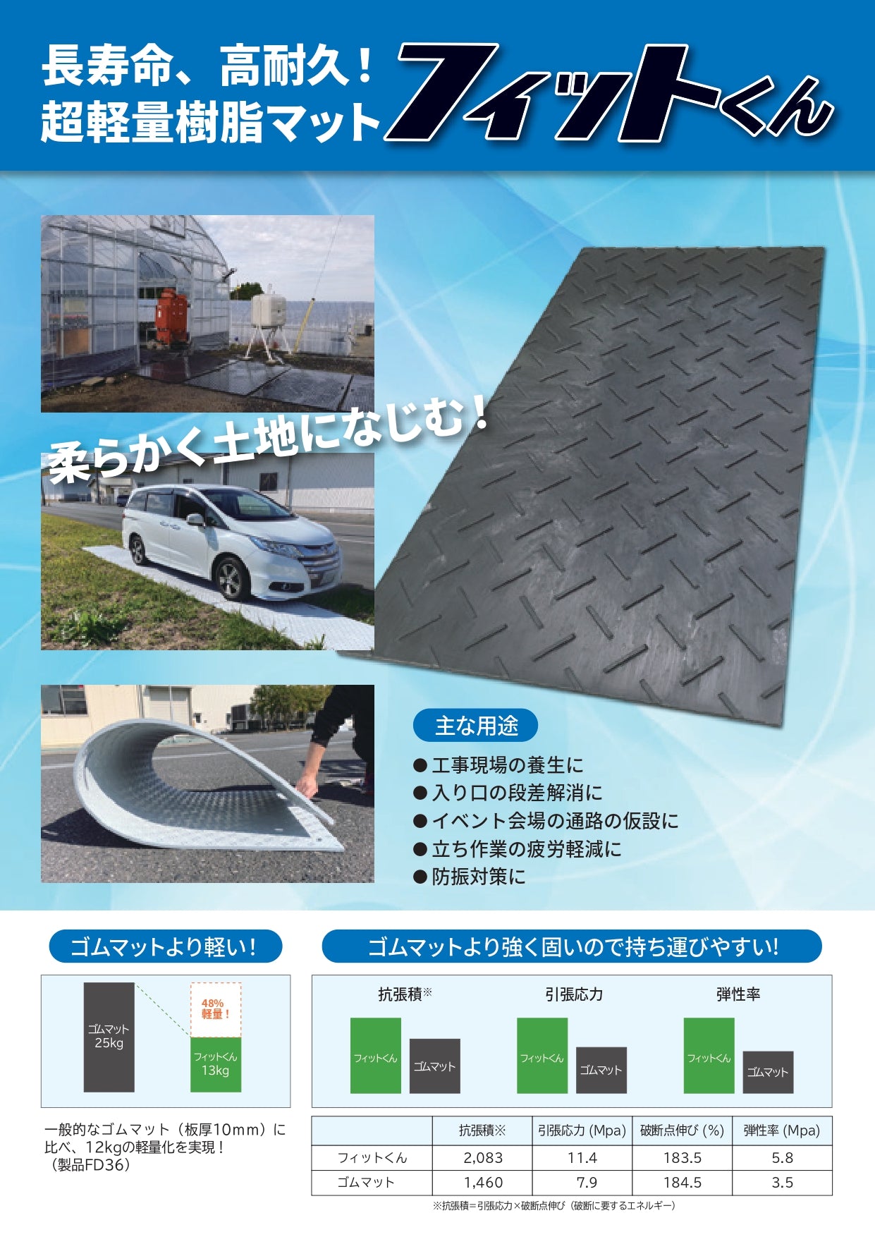 ゴムマットより丈夫で軽量なフィットくん。柔らかく土地になじみやすく、ゴムマットより軽く硬いため、人の手で運搬しやすい資材です。通常のゴムマットに比べサイズ展開豊富です。イベント会場や芝生養生、ビニールハウスの入口に。